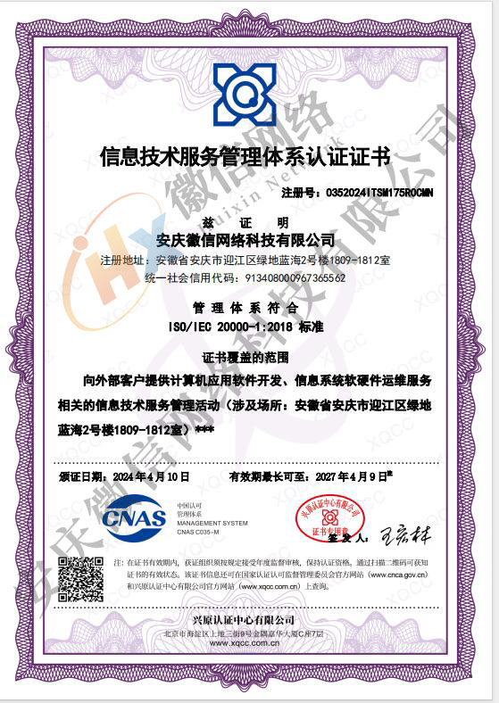 信息技術(shù)服務(wù)管理體系認(rèn)證證書