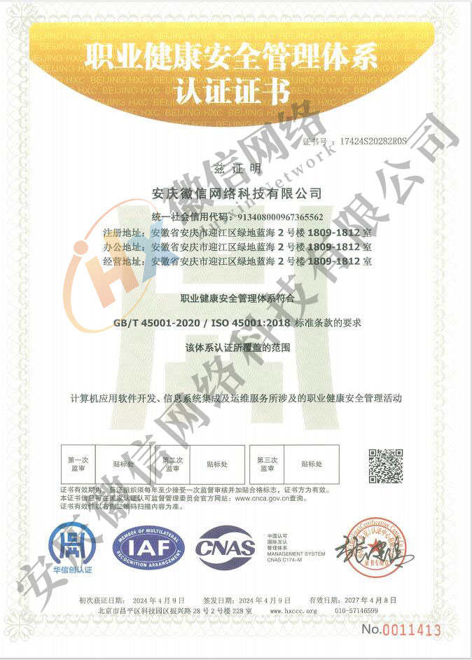 職業(yè)健康安全管理體系認(rèn)證證書
